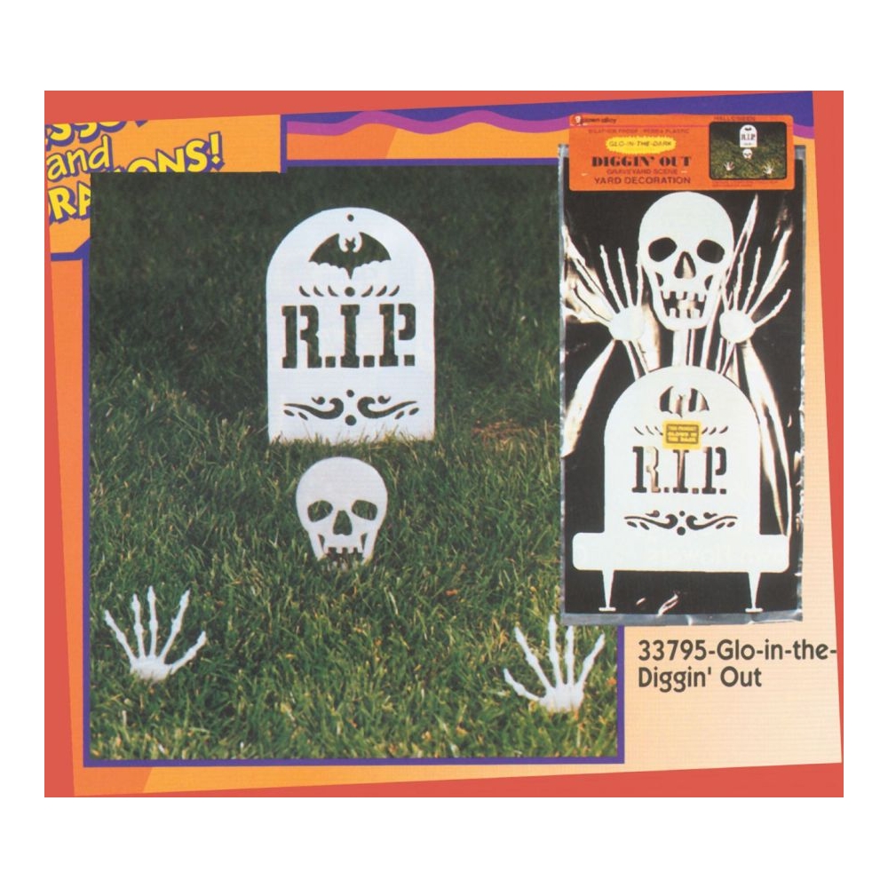 Amusing And Easy To Set Up. Set Includes 1 Tombstone, 1 Skull, And A Pair Of Hands. Simply Push The Sturdy Glow-In-The-Dark Plastic Pieces Into Your Lawn With The Attached Spikes And Enjoy. 22 In X 11 1-2 In X 1-8 In