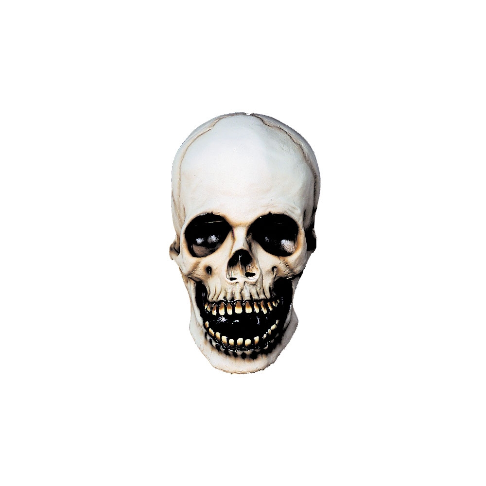 White Skull Mask Has Hollowed Out Eyes And The Mouth Is Wide Open Showing His Yellow Teeth.