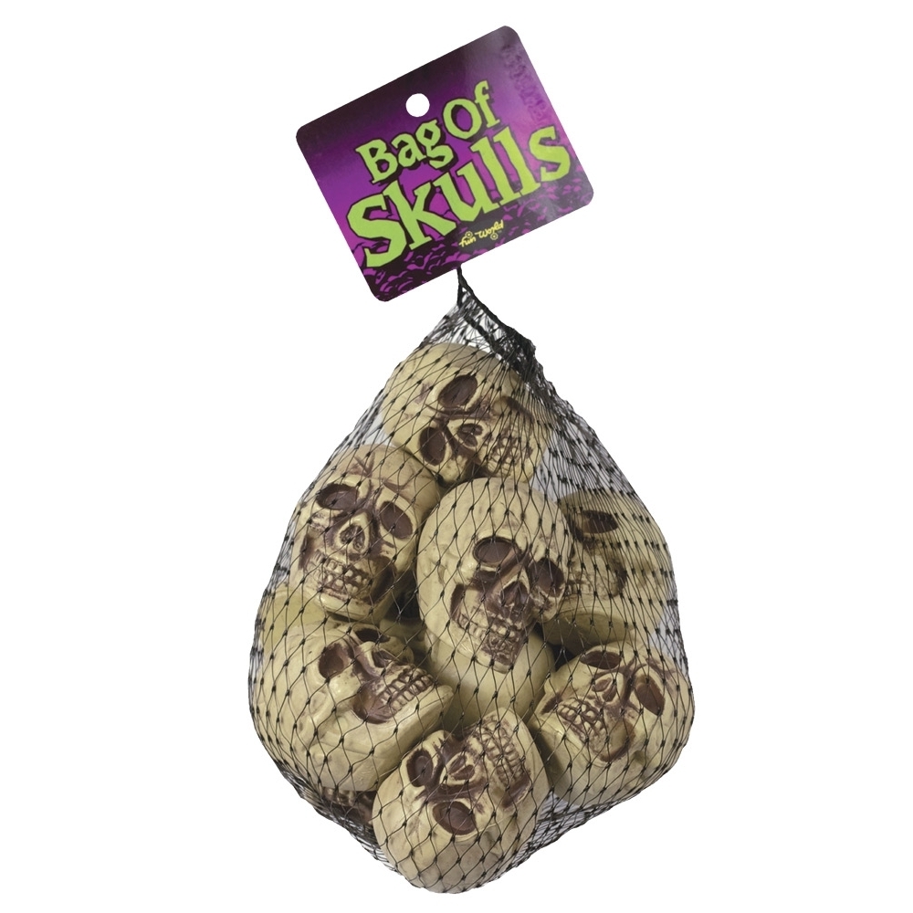 A great prop for just hanging in your house or a haunted house like a bag of collected skulls or also great taken out of bag and strewing skulls all over your haunt area. Bag of 12 skulls in netting.