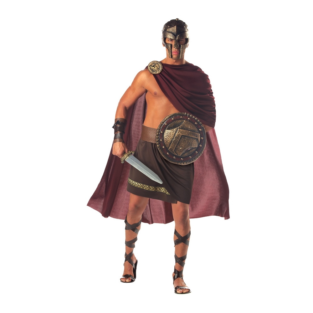 A Great Costume For A True Warrior! Burgundy-Colored Cape With Medallion, Wrap With Belt, Helmet And Cuffs. Sword, Shield And Sandals Not Included. Adult Men'S Xlarge Fits Sizes 44-46.