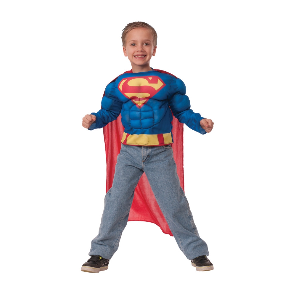 A Quick And Easy Superman Costume For Your Child! Muscle Chest Shirt With Classic Superman Colors And Insignia With Attached Cape. Fits Child Small Size 4-6.