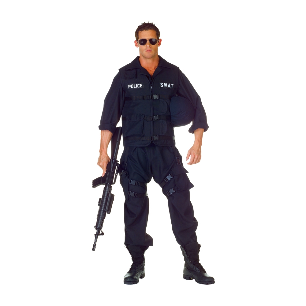 Jumpsuit, Vest, Thigh Holster, Thigh Pouch And Helmet With Fabric Cover. One Size Fits Most Up To 44. Weapon And Glasses Are Not Included.