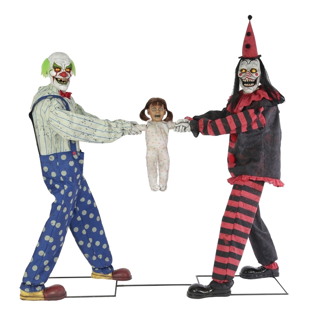 Two creepy clowns play tug of war with a screaming little girl while lots of humorous conversation goes back and forth and old calliope music plays! Plug the UL power adapter into any standard outlet and choose from Steady-On, Infra-Red Sensor or Step-Here Pad (included) activation options to operate. The infra-red sensor works up to 6.5 feet away in bright light to no light! Includes volume control. Easy-to-assemble quick-connect poles. Includes Step Here activation pad. Assembly required. 73 in High x76 in Wide x 21 in Deep.