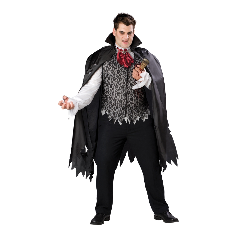 Adult Size 54-56. Give Your Friends A Real Scare When You Wear This Great Vampire Costume. Package Includes: Cape, Vest Overlay, Top With Attached Realistic Vinyl Stake, And Ascot With Medallion. Pants And Fake Blood On Mouth And Hands Not Included. 100% Polyester.